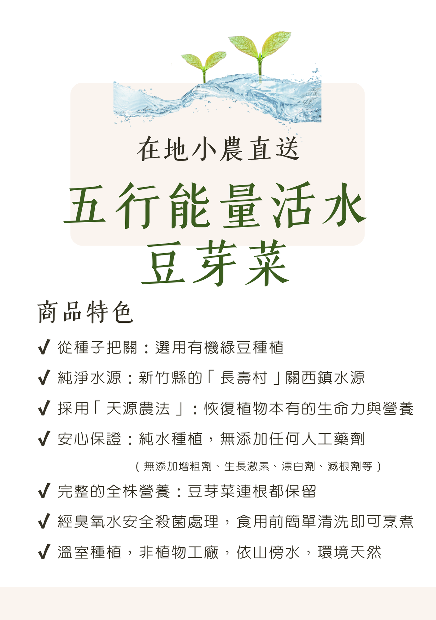 ✔ 從種子把關:選用有機綠豆種植✔ 純淨水源:新竹縣的「長壽村」關西鎮水源✔ 採用「天源農法」:恢復植物本有的生命力與營養✔ 安心保證:純水種植,無添加任何人工藥劑 (無添加增粗劑、生長激素、漂白劑、滅根劑等)✔ 完整的全株營養:豆芽菜連根都保留✔ 經臭氧水安全殺菌處理,食用前簡單清洗即可烹煮✔ 溫室種植,非植物工廠,依山傍水,環境天然